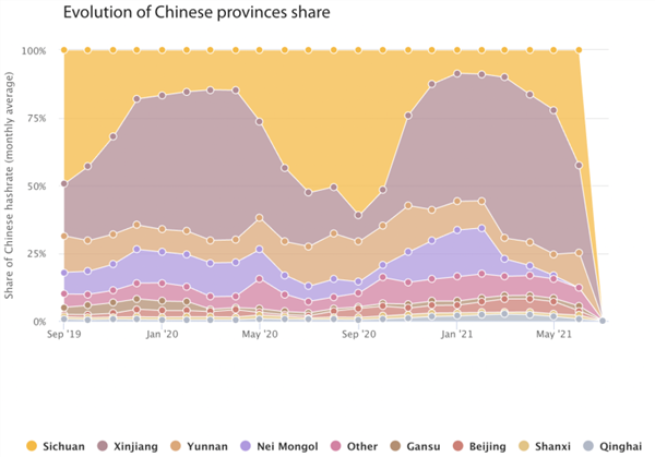 据剑桥大学数据,截至2021年8月末,根据IP地址统计,中国大陆地区的挖矿算力在全网的占比接近于零。