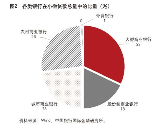 中小银行理应成为服务中小企业的主力军,但目前还未充分发挥其应有作用。近些年来,我国中小银行、村镇银行、民营银行发展迅速,银行机构数增长很快。2010~2016年,农村商业银行从85家增加到1114家,村镇银行从349家增加到1443家,银行业机构总数增加630家(因农村信用社等数量减少,所以新增机构总数并非两者之和)。2017年末,农村商业银行小微贷款余额不到6万亿元,仅占其总资产的25%左右,农村商业银行贷存比为48%,低于大型银行的57%;农村商业银行在小微贷款总量中的占比为26%,低于大型银行的32%(见图2)。相比较而言,一些村镇银行在发放小微贷款方面发挥了非常积极的作用,如2017年中银富登村镇银行贷存比达到105%,贷款主要支持所在县域个人和小微企业。