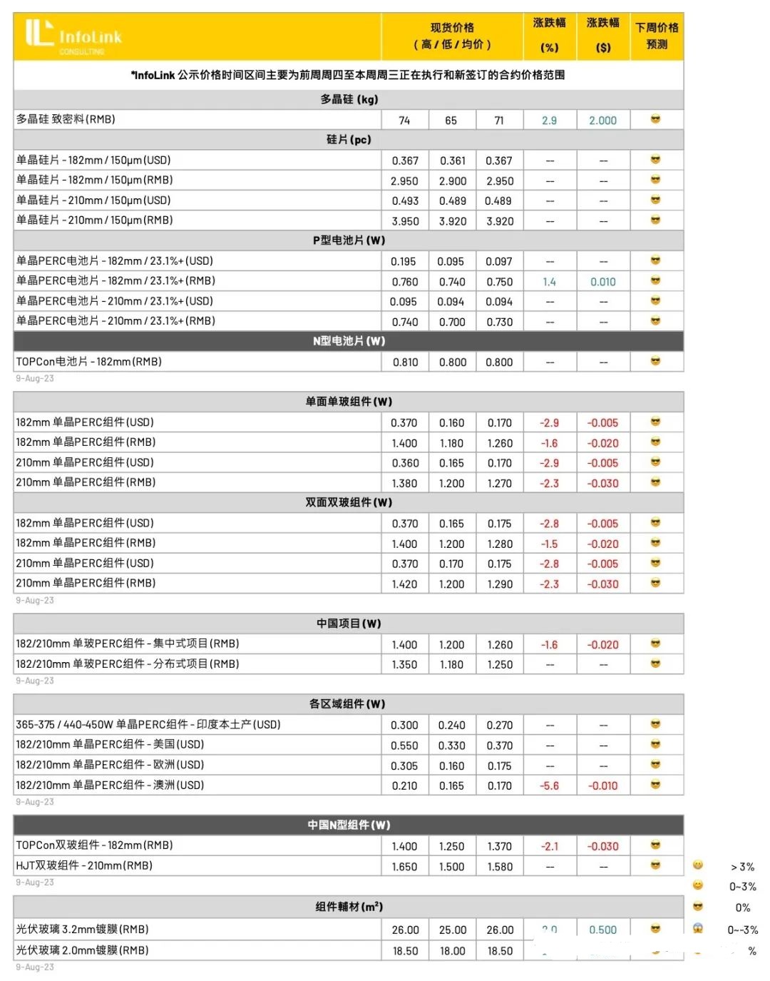 然而,当前每瓦0.75元人民币的电池片售价对于外采电池片的组件厂家来说已难拥有盈利空间,本周起也陆续传出组件厂家规划减产,甚至其中也不乏一线组件厂家,迭加组件辅材料如玻璃等价格也在上行,预期当前电池片价格已濒临相对顶点,下周走势维稳看待。