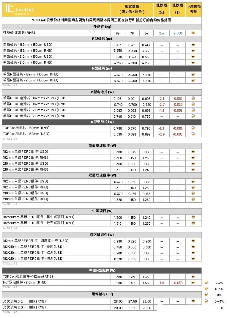 本周组件价格持稳,9月组件新单价格仍有所分化,整体涨价动能仍较不足、大机率持平为主。