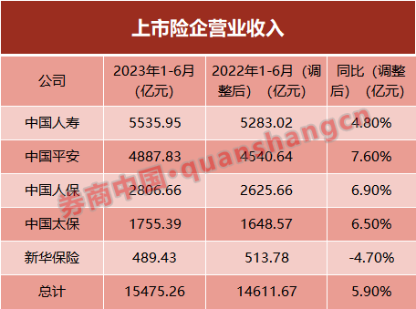 从营业收入来看,五大A股上市险企半年度营收1.5万亿元,按调整后数值,同比增长5.9%达到1.55万亿元。除了新华保险同比下降4.7%,其他四家险企均实现营收正增长。