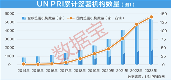 二是认同ESG理念的机构数量创历史新高。截至2023年末,全球签约联合国负责任投资原则组织(UN PRI)的机构达5370家,较2022年增加463家;中国UN PRI签署方达139家,较2022年增加21家,均创出历史新高(图1)。