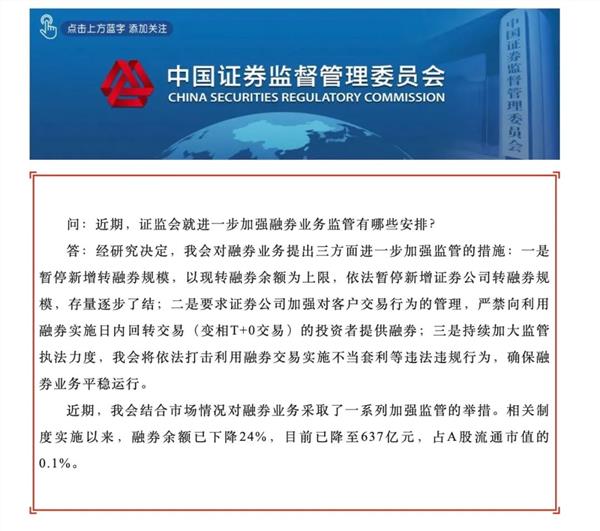 近期,我会结合市场情况对融券业务采取了一系列加强监管的举措。相关制度实施以来,融券余额已下降24%,目前已降至637亿元,占A股流通市值的0.1%。