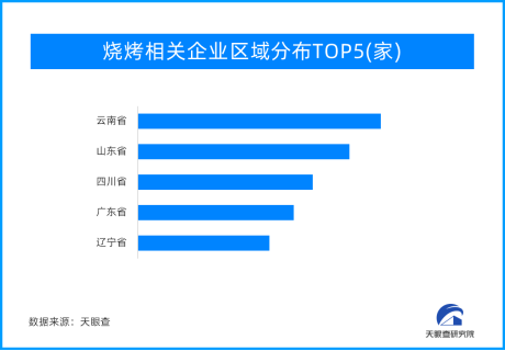 天眼查专业版数据显示,截至目前,现存与烧烤相关的企业59.6万余家,其中,2024年1-4月,新增注册相关企业3.3万余家;从地域分布来看,云南、山东以及四川,三地所拥有的烧烤相关企业位居前列,分别有5.4万余家、4.7万余家以及3.9万余家;从成立时间来看,50.7%的相关企业成立于1-5年内,成立于1年以内的相关企业占16.5%。