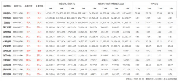 行业重点公司最新盈利预测综合值