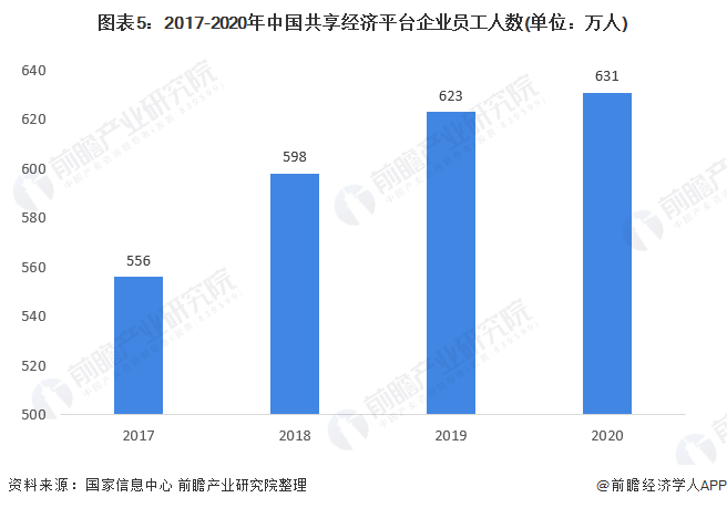 从共享经济平台企业员工人数上看,2017-2020年,我国共享经济平台企业员工人数逐年增长,初步估算,2020年我国共享经济平台企业员工数631万人,同比增长约1.3%。
