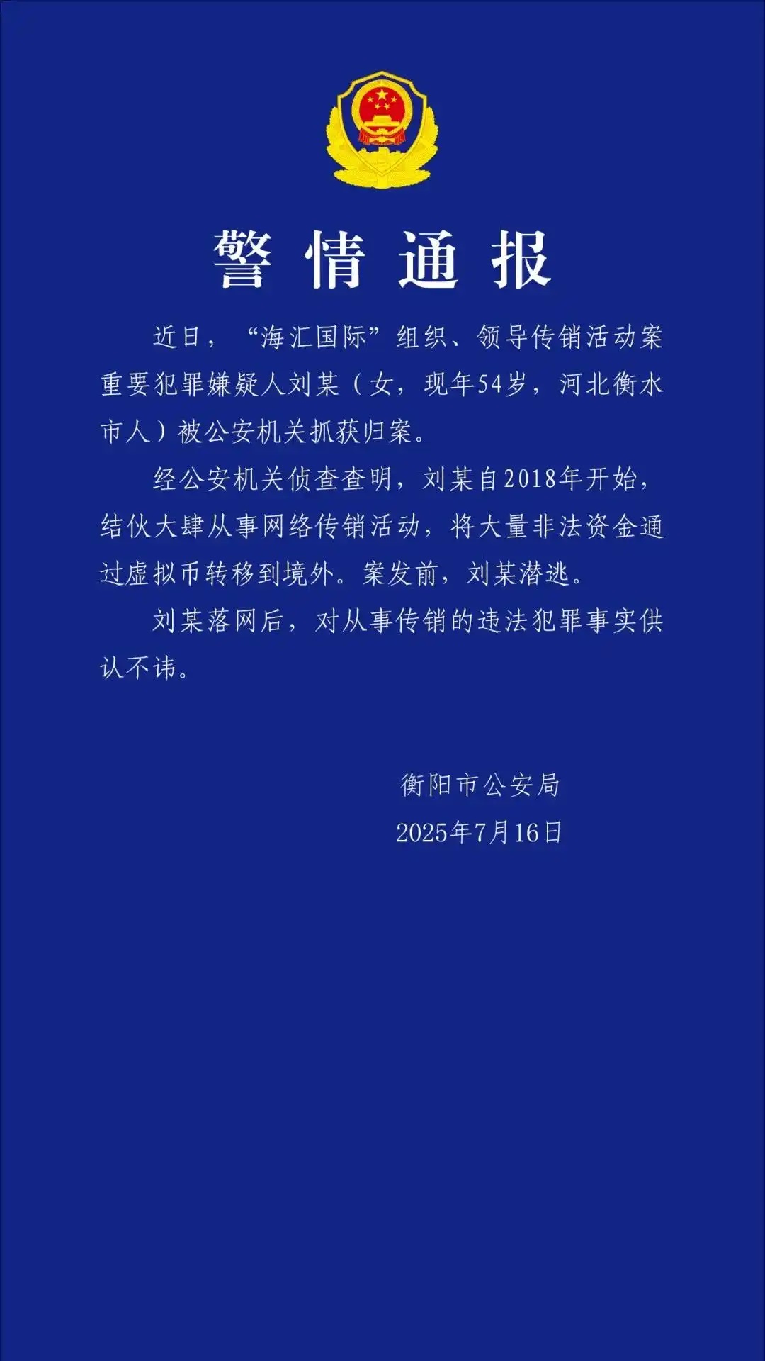 7月16日,衡阳市公安局通报:近日,“海汇国际”组织、领导传销活动案重要犯罪嫌疑人刘某(女,现年54岁,河北衡水市人)被公安机关抓获归案。经公安机关侦查查明,刘某自2018年开始,结伙大肆从事网络传销活动,将大量非法资金通过虚拟币转移到境外。案发前,刘某潜逃。刘某落网后,对从事传销的违法犯罪事实供认不讳。