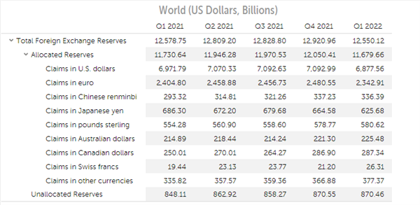 数据显示,2022年第一季度,美元仍是全球最广泛持有的储备货币,在所有外汇储备中的所占份额为58.88%,与去年第四季度持平,但同比去年第一季度的59.4%小幅下滑。