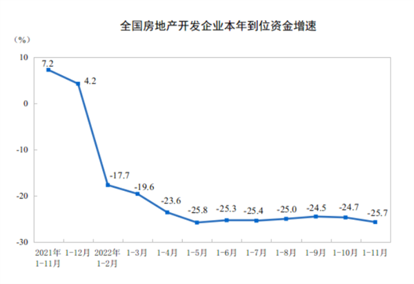 国家统计局12月15日发布的最新数据显示,1-11月份,商品房销售面积同比下降23.3%,商品房销售额同比下降26.6%,降幅分别扩大了1个和0.5个百分点;房地产开发投资同比下降9.8%,降幅扩大了1个百分点;房企到位资金同比下降25.7%,降幅扩大了1个百分点。