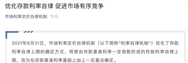 6月21日,市场利率定价自律机制秘书处在其官方微 信号上公布了相关消息。发布称,自6月21日起,存款利率自律上限的确定方式,将原由存款基准利率一定倍数形成的存款利率自律上限,改为在存款基准利率基础上加上一定基点确定。