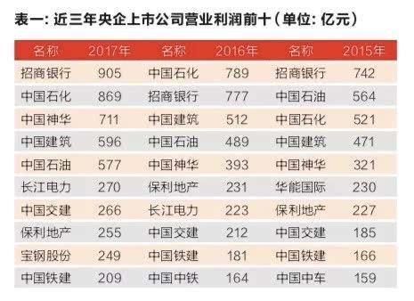 进一步观察发现,2015年到2017年,央企上市公司利润前十名中(见表一),招商银行中国石化中国石油中国神华中国建筑保利地产中国交建中国铁建等8家每年都榜上有名,表现可以说较为稳定。